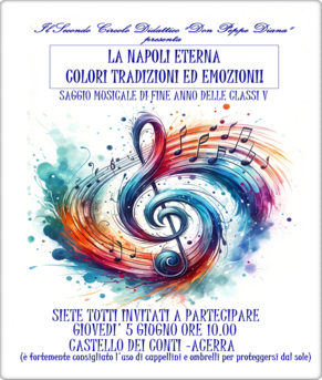 10:00 - Al Castello dei Conti di Acerra ci sarà uno spettacolo con la partecipazione delle classi A-B-C-D-E-F-G , che si alterneranno sul palco (è fortemente consigliato l'uso di cappellini e ombrelli per proteggersi dal sole)
